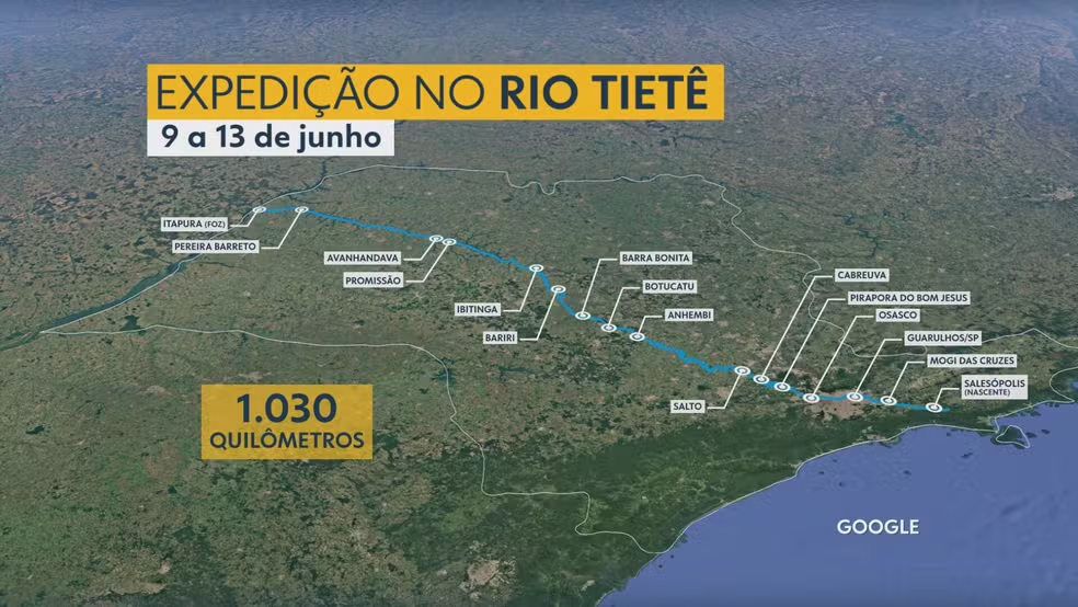 A expedição começou na segunda (9) na cidade de Salesópolis, que é a nascente do rio, e chegará até foz na sexta (13). Neste momento, a expedição está em Osasco, na Região Metropolitana, onde o rio é bastante poluído. A última cidade será Itapura.