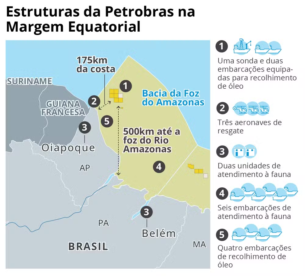 Cerca de 400 profissionais participaram da operação, que contou com 13 embarcações e três aeronaves. O local de pesquisa no mar fica a 175 Km da Costa do Amapá e a mais de 500 Km da Foz do Rio Amazonas, apesar de este ser o nome da bacia em que está localizada a área.